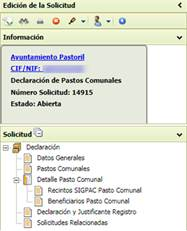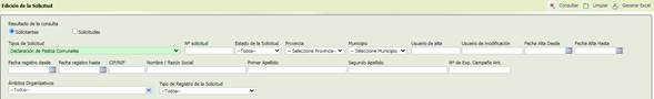 El formulario de búsqueda y filtrado para la edicion y el funcionamiento de la Declaración de Pastos Comunales es similar al detallado en Solicitud Única. Edición de la Solicitud. En el combo [Tipo de Solicitud]: se escogerá “Declaración de Pastos Comunales”.
