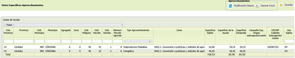 se exporta la información de la pantalla Datos Específicos aprovechamientos o si está activo algún filtro por línea de ayuda PDR, se exportan los datos filtrados.