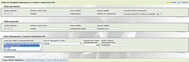 El campo “Código de subrogación” aparece para autorizaciones de Subrogaciones / Cesiones de compromisos PDR confirmadas siempre que se haya parametrizado para que se muestre.