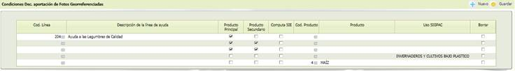 · [Producto]: Producto declarado. Cuando se rellene las condiciones en el catálogo por parte del OP: para el campo [Producto] se deberá acompañar del check de [Producto Principal] y/o [Producto Secundario] para indicar si el producto a considerar es el principal o el secundario.