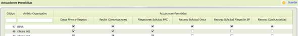 · [Datos Firma y Registro]: Casilla de verificación. El ámbito organizativo que tenga marcada la casilla tendrá permitido realizar la firma y el registro de las solicitudes de sus representados.