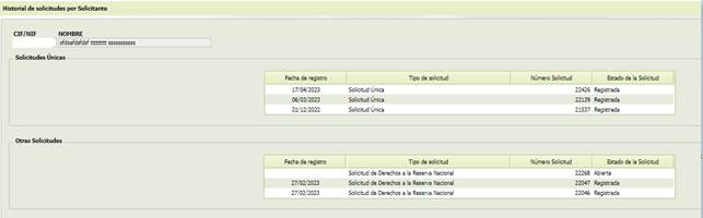 Se mostrarán dos listados con la información de las solicitudes realizadas en la campaña por el CIF/NIF consultado, separadas en “Solicitudes Únicas y en “Otras Solicitudes”.
