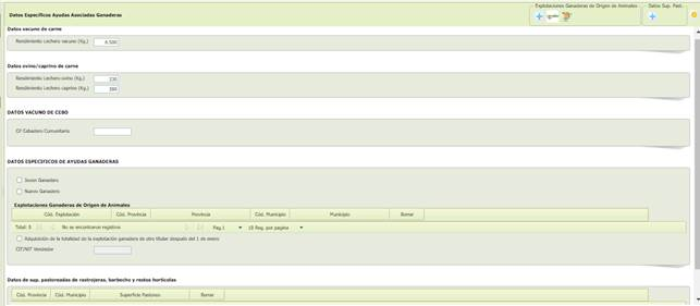 Al marcar Ayudas Asociadas de Ganadería se generará el impreso de Ayudas Ganaderas. En este impreso se recogerán los Datos Específicos de Ayudas Ganaderas: si es joven o nuevo ganadero y la codificación de las explotaciones ganaderas de los animales.