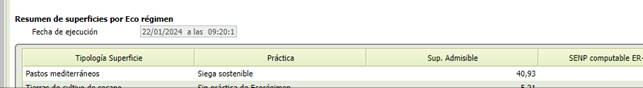 En este resumen se desglosa las superficies de cada Eco régimen en función de los productos declarados, la ubicación de los recintos y las prácticas solicitadas, así como las SENP computables a efectos de Eco regímenes
